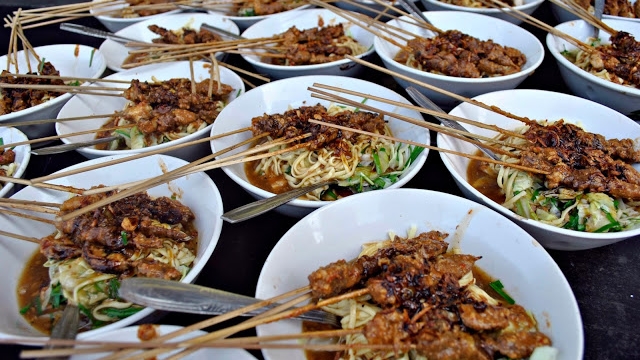 Sajian lengkap mie Ongklok, ditambah sate sapi & geblek… Top tenan!